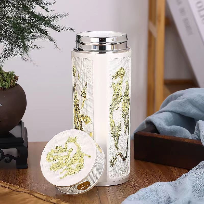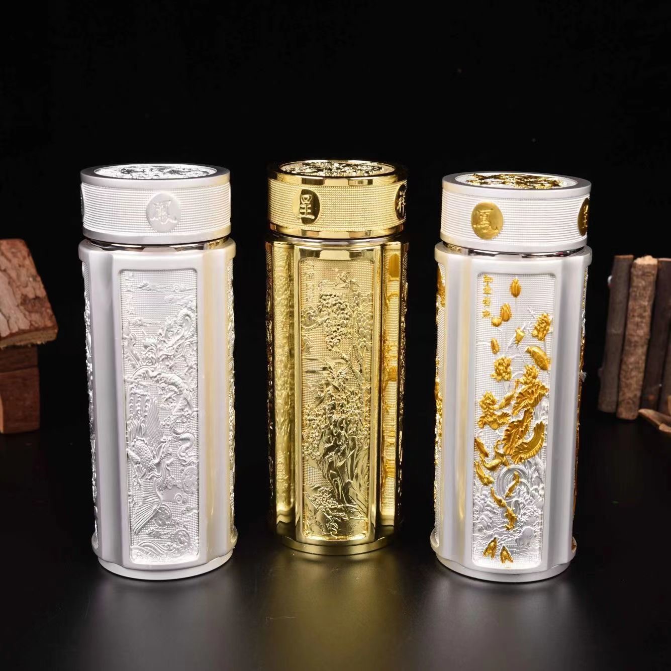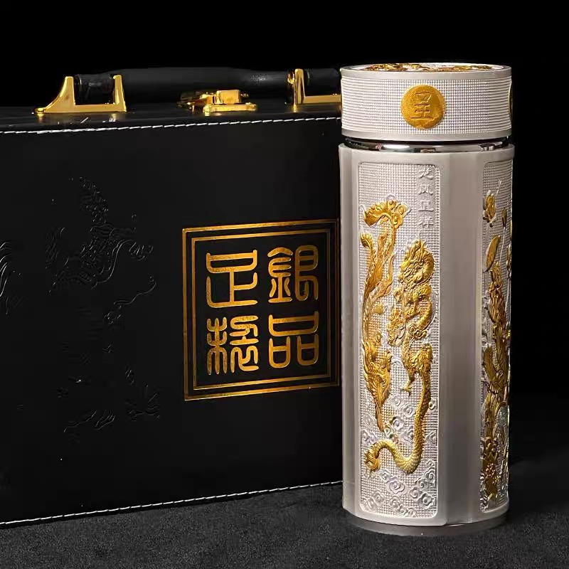 (特价)秒杀精品龙凤呈祥浮雕工艺银离子纯银内胆S999足银高档正品长辈金银水杯保温杯500ml八B17-2-2